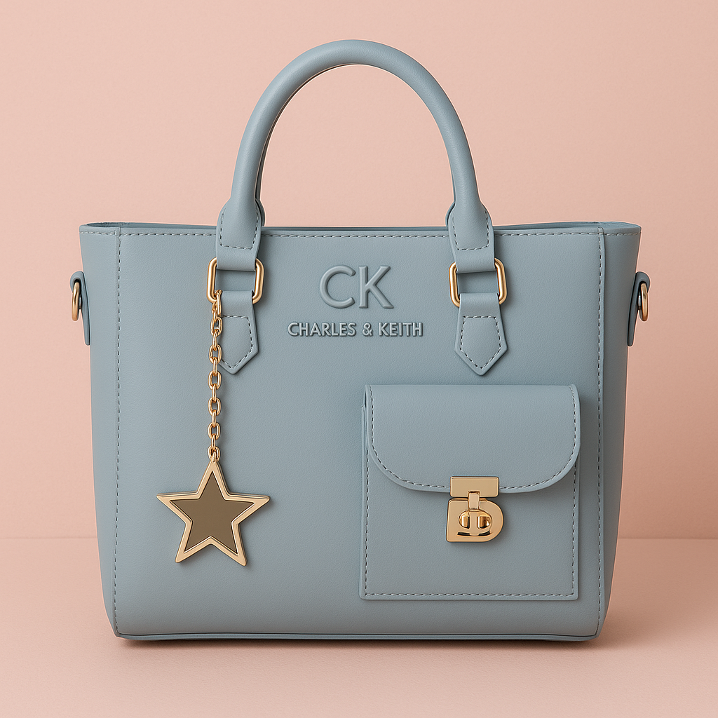Turn heads with this elegant sky blue tote handbag, featuring a gold star charm, front flap pocket, and Charles & Keith-inspired design. Perfect for daily wear with a touch of glam!